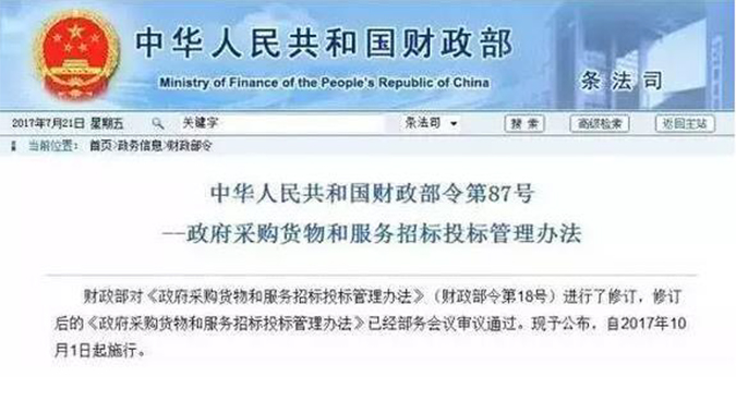 近日,财政部印发财政部令87号《政府采购货物和服务招标投标管理办法》,自2017年10月1日起施行。